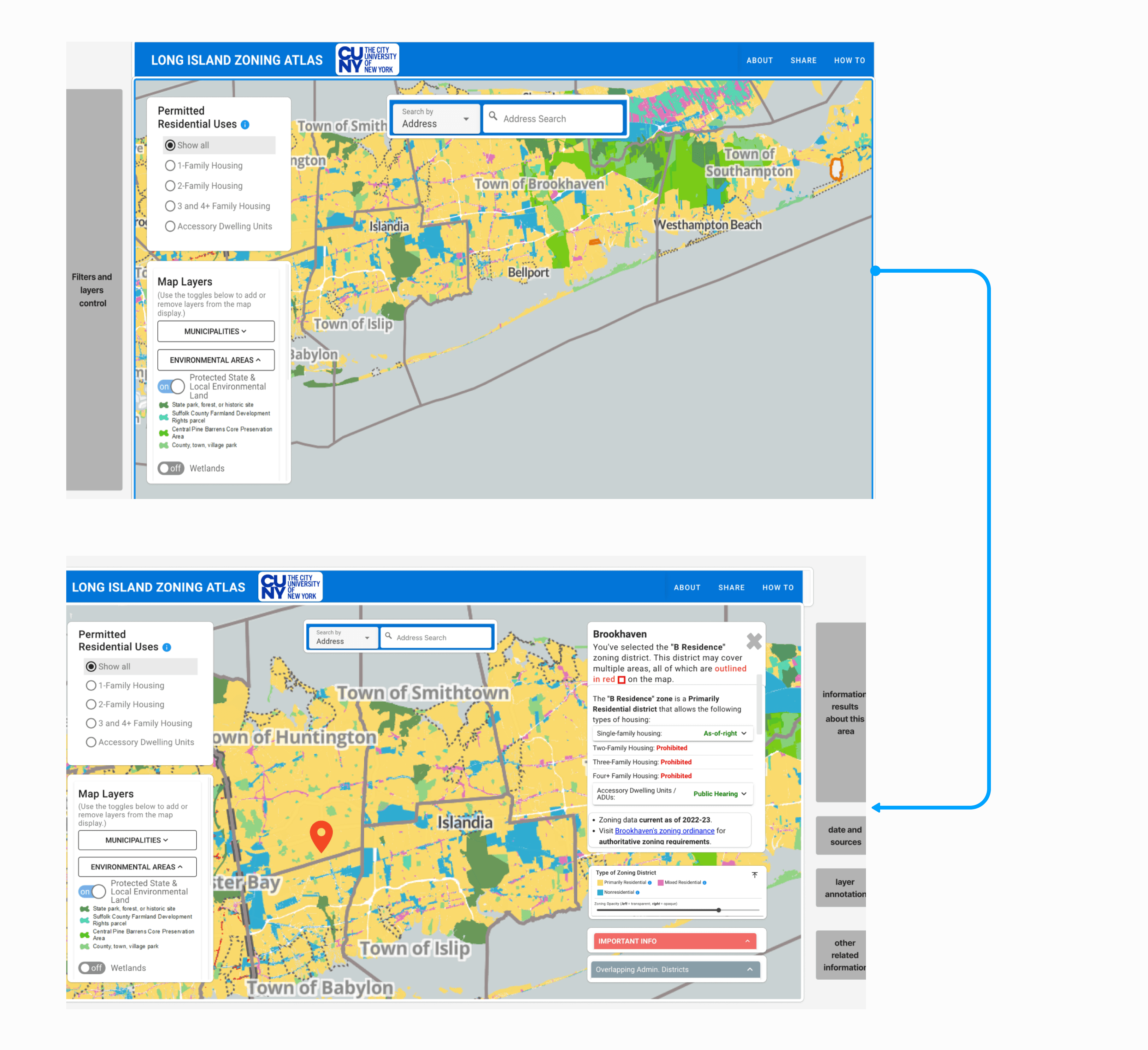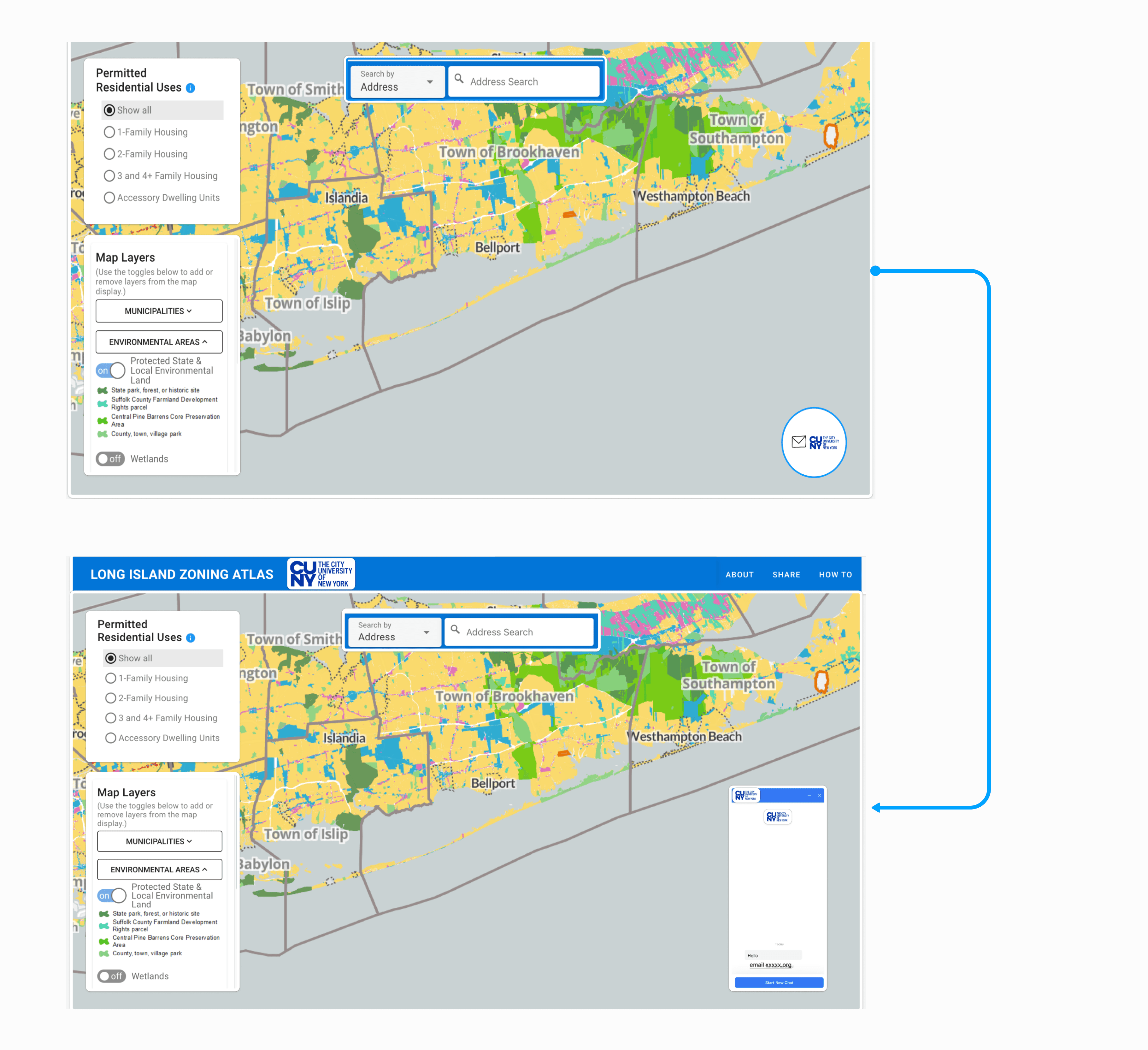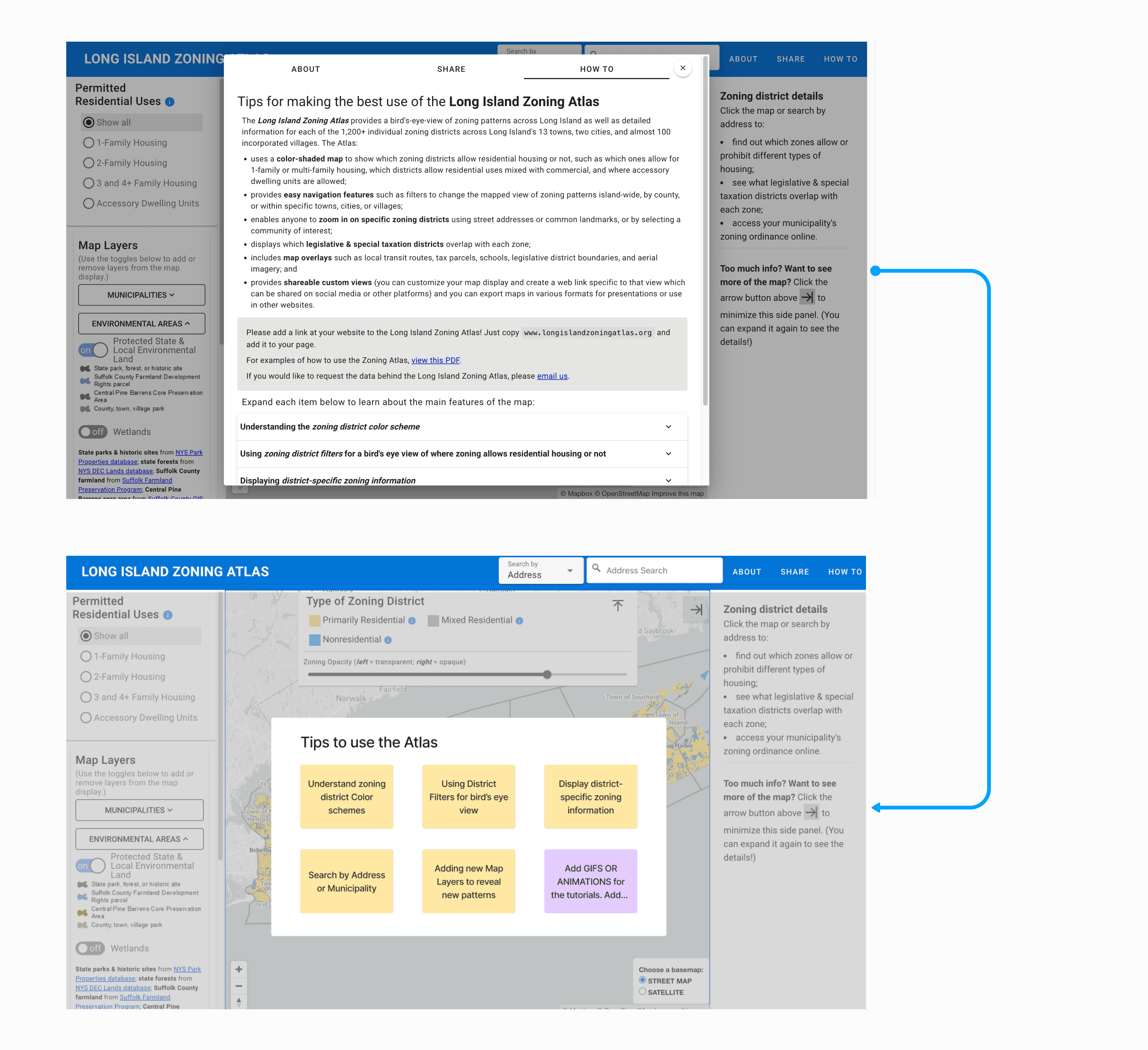 We opted to redesign the pop-up as a brand-new landing page that reflects the Long Island Zoning Atlas branding and offers users the choice to either navigate the map or access a tutorial for guidance.