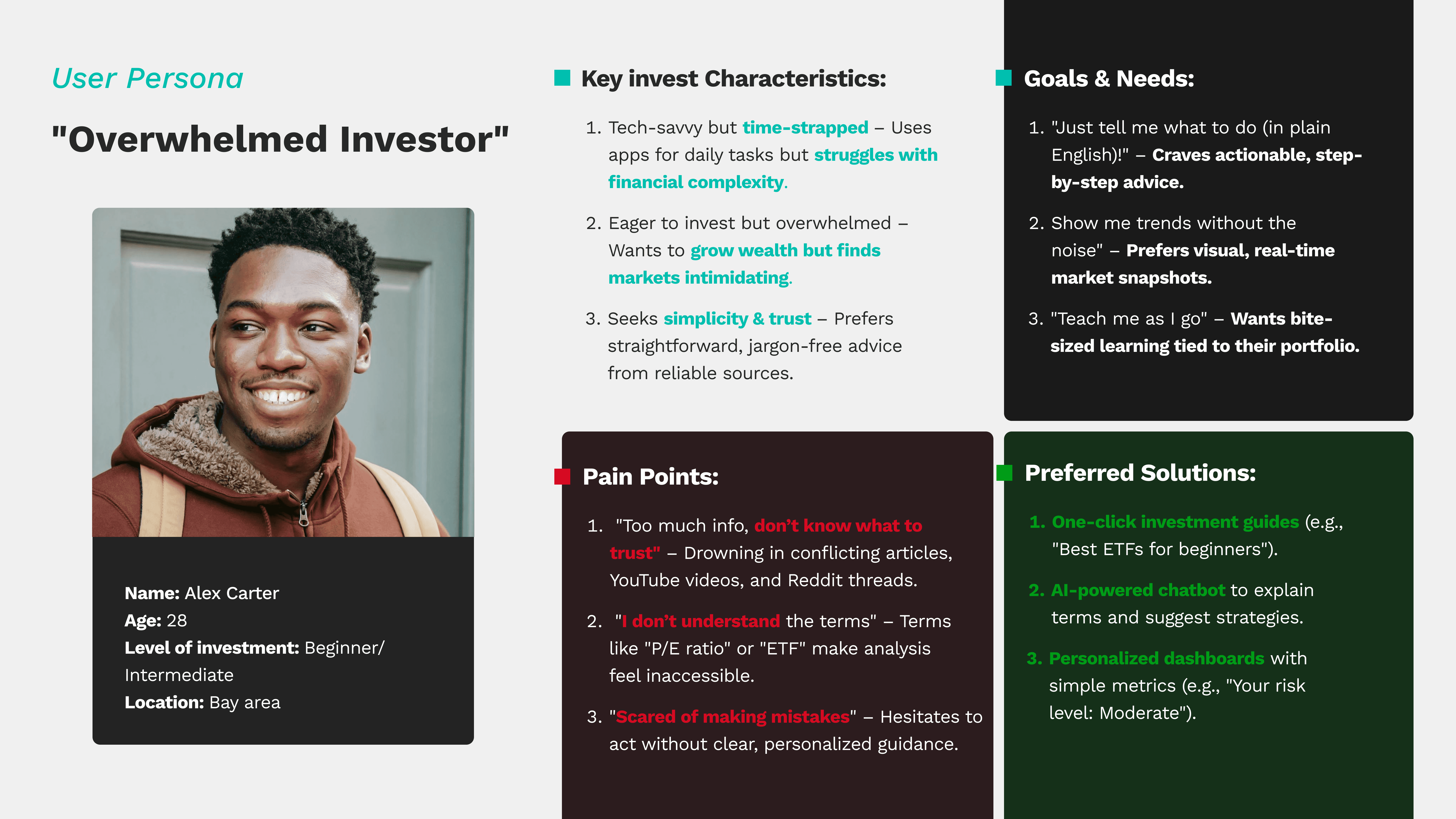 Junior and intermediate investors are overwhelmed by information noise and struggle to find useful insights for confident investing.